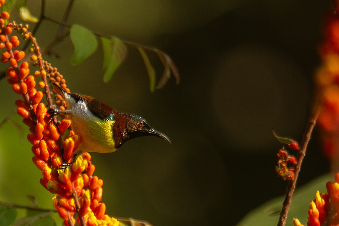 In contrast, sunbirds typically feed while perched and have a more traditional flight style, which helps us understand their different feeding strategies and habitats. Sunbirds’ inability to hover means they need stable perches to access nectar, which influences the types of flowers they pollinate. As a result, sunbird-pollinated flowers often have sturdier structures. These could be open inflorescences, cluster flowers or larger blossoms that provide a reliable landing spot. I am no expert, but the leaves seem sturdier as well in these parts for sunbirds to perch on, while feeding, as in the second picture below.